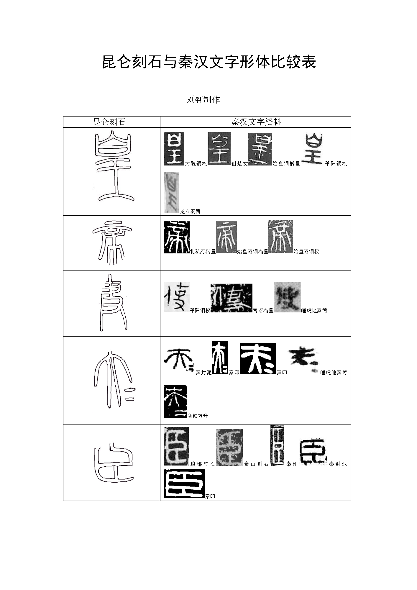 刘钊制作的《昆仑刻石与秦汉文字形体比较表》。